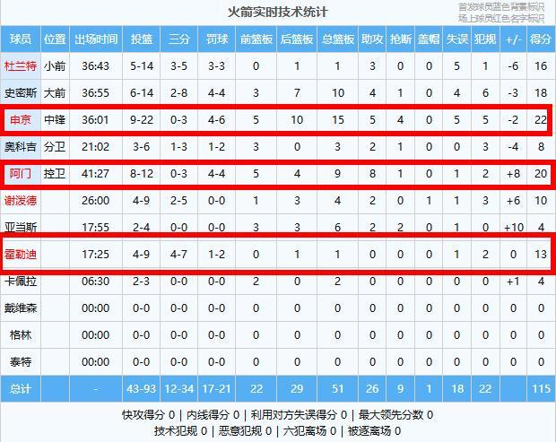 申京22分15板5助4断、阿门20分9板8助、史密斯18分10板4助、杜兰特16分1板3助、霍勒迪13分1板、谢泼德10分4板2助、奥科吉8分3板2助、亚当斯4分6板2助2断、卡佩拉4分2板